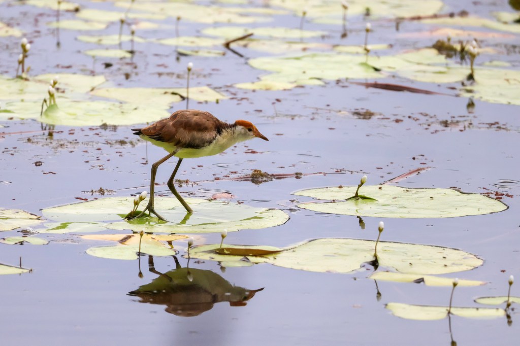 A family of cute Comb-crested Jacanas ran across the lilypads. There was 1 adult and 4 chicks.
