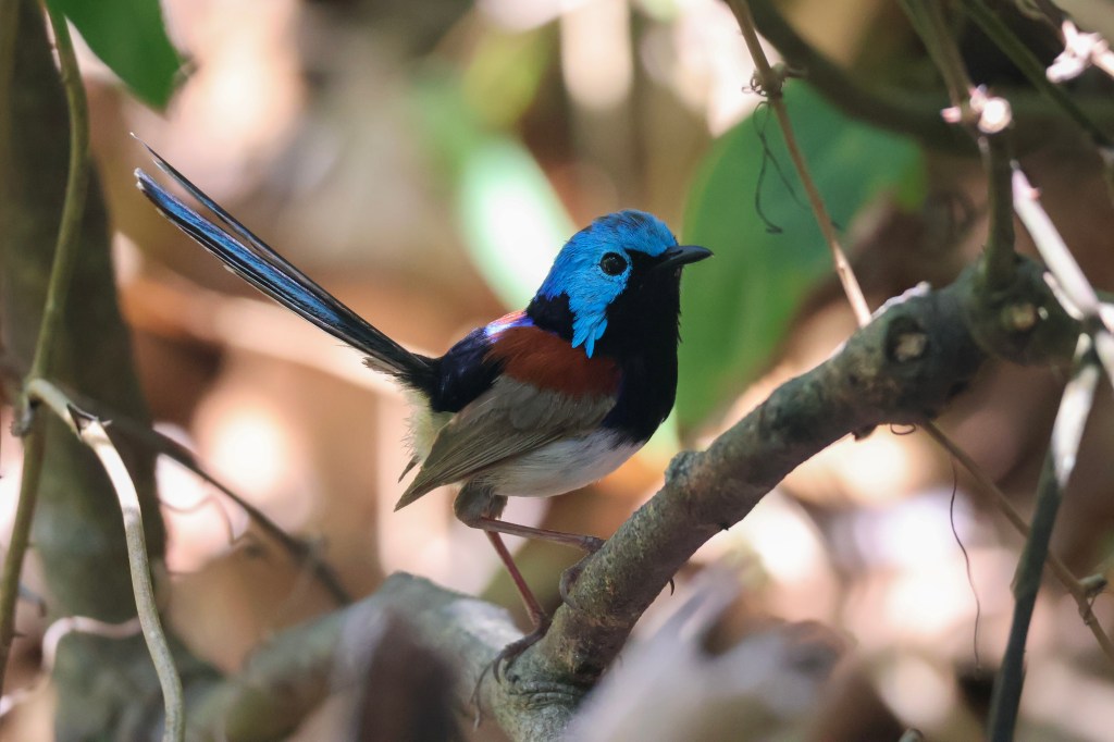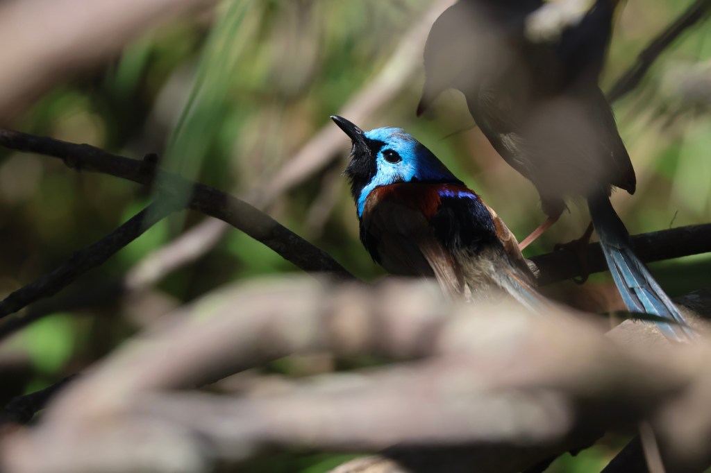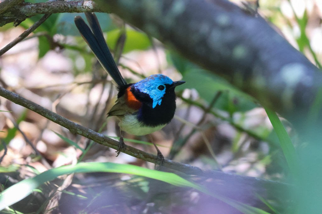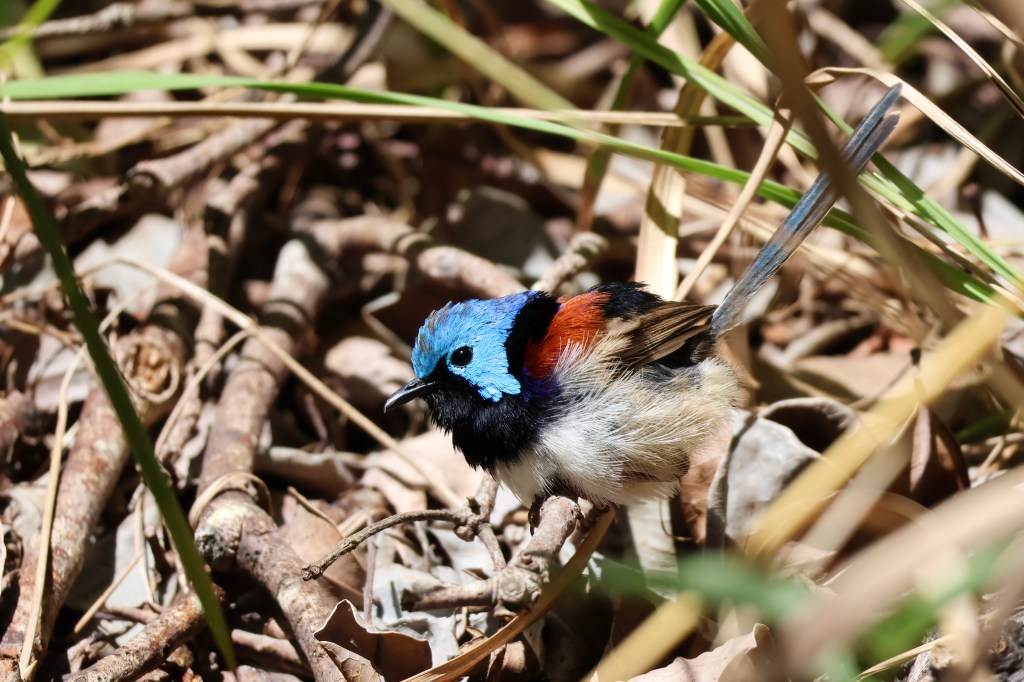 At the same time, a group of Variegated Fairywrens flitted in the bushes, among them 3 males. These beautiful wrens have a more vibrant blue than the Superb Fairywrens, and some rufous on their backs. I never dreamed I would get these photos.